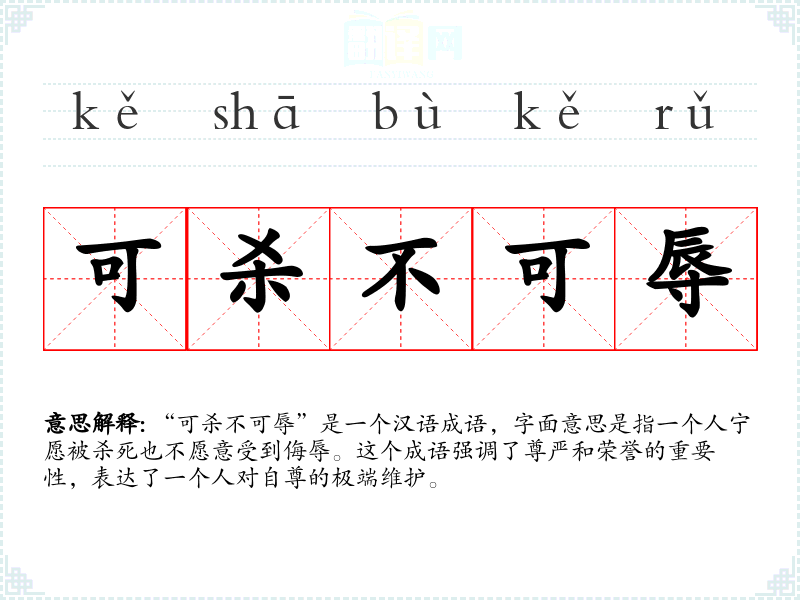 “可杀不可辱”是一个汉语成语,字面意思是指一个人宁愿被杀死也不愿意受到侮辱。这个成语强调了尊严和荣誉的重要性,表达了一个人对自尊的极端维护。