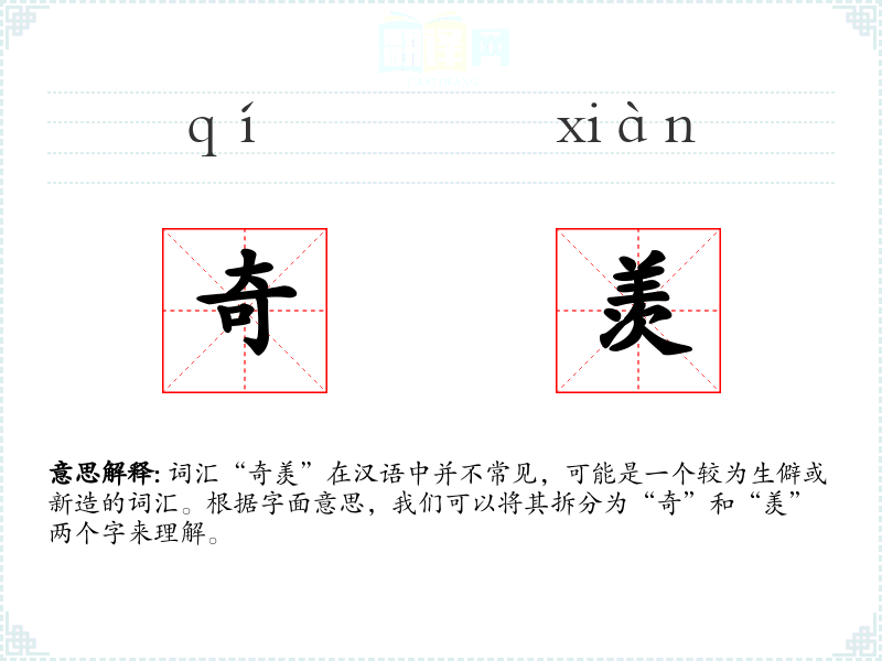 词汇“奇羡”在汉语中并不常见,可能是一个较为生僻或新造的词汇。根据字面意思,我们可以将其拆分为“奇”和“羡”两个字来理解。