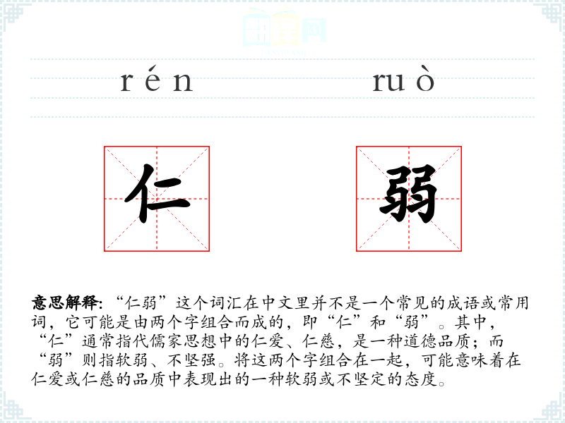 “仁”字源自儒家思想,强调人与人之间的爱和关怀;“弱”字则是一个描述物理或心理状态的词。这两个字的组合可能是现代语言使用中的一个创新,用以描述在仁爱行为中表现出的软弱特质。