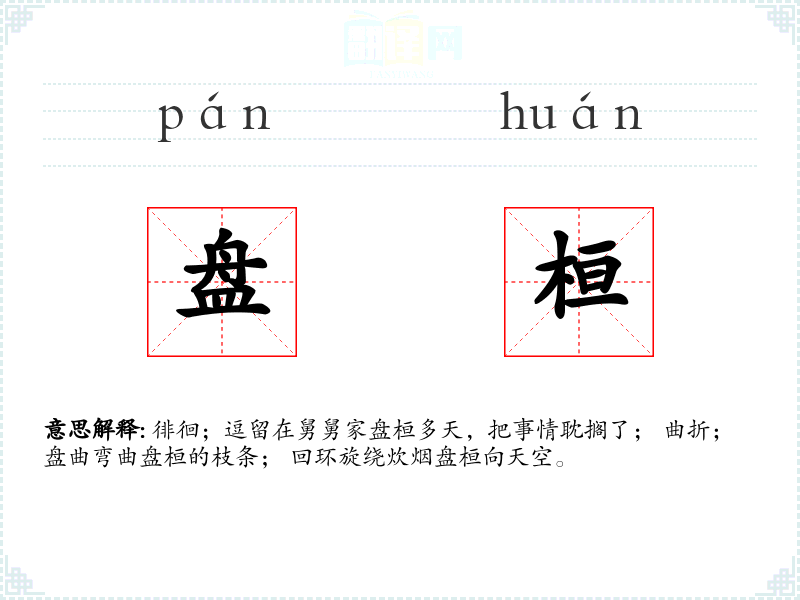 徘徊;逗留在舅舅家盘桓多天,把事情耽搁了; 曲折;盘曲弯曲盘桓的枝条; 回环旋绕炊烟盘桓向天空。