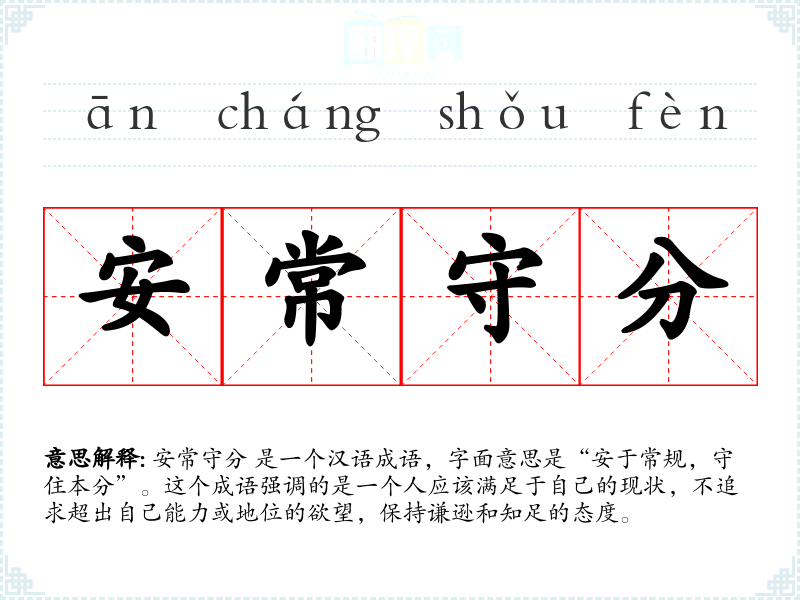 安常守分 是一个汉语成语,字面意思是“安于常规,守住本分”。这个成语强调的是一个人应该满足于自己的现状,不追求超出自己能力或地位的欲望,保持谦逊和知足的态度。