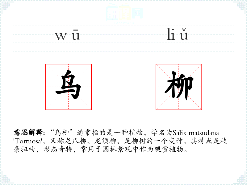 - 反义词:直柳(指枝条直立的柳树,与乌柳的扭曲形态相对)
