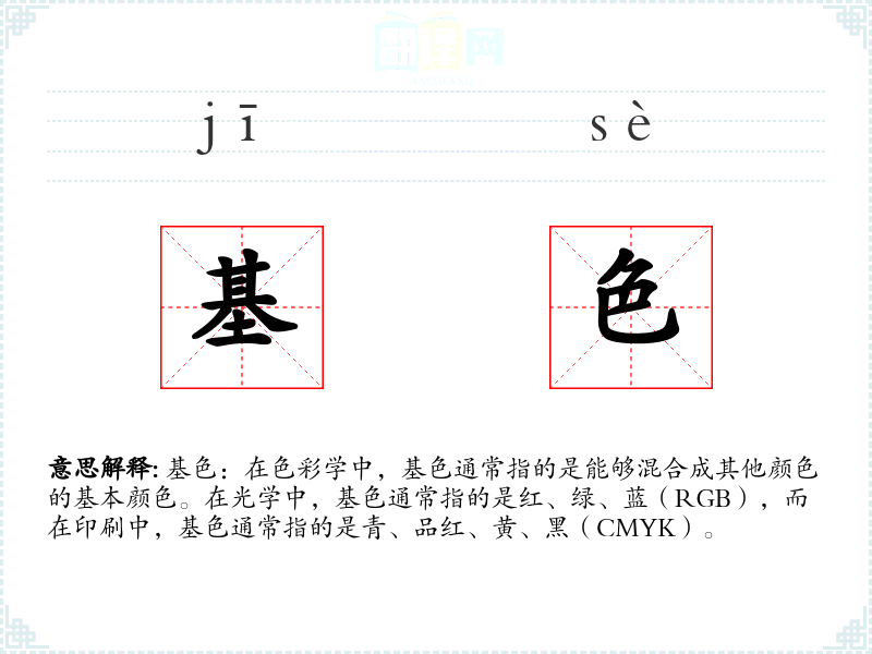 基色:在色彩学中,基色通常指的是能够混合成其他颜色的基本颜色。在光学中,基色通常指的是红、绿、蓝(RGB),而在印刷中,基色通常指的是青、品红、黄、黑(CMYK)。