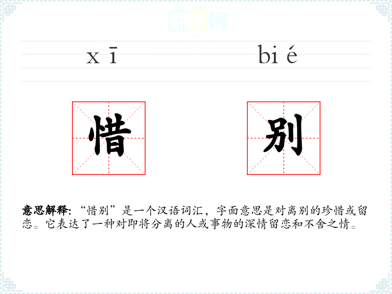 “惜别”是一个汉语词汇,字面意思是对离别的珍惜或留恋。它表达了一种对即将分离的人或事物的深情留恋和不舍之情。