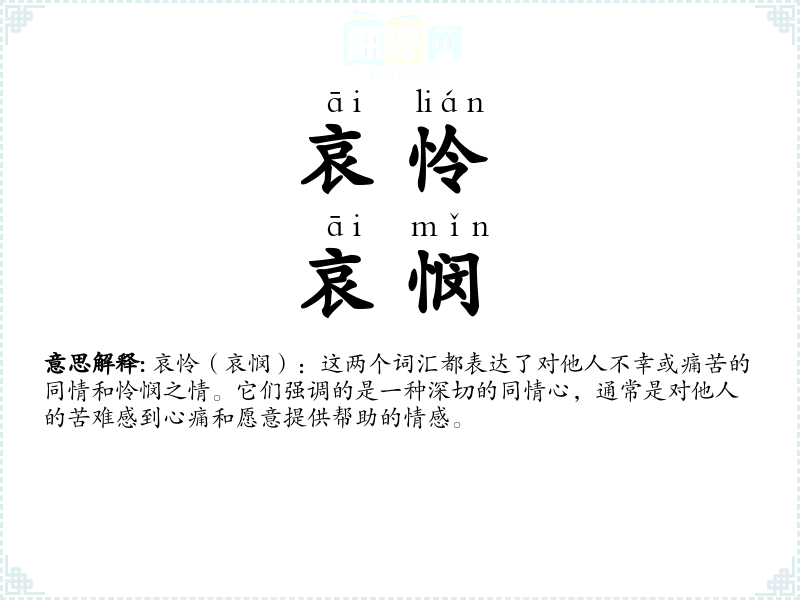 - 词源:哀怜(哀悯)源自古代汉语,其中“哀”表示悲伤,“怜”表示同情。这两个字组合在一起,强调了对他人的深切同情。