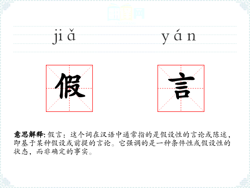 假言:这个词在汉语中通常指的是假设性的言论或陈述,即基于某种假设或前提的言论。它强调的是一种条件性或假设性的状态,而非确定的事实。