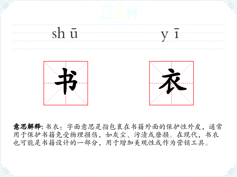 书衣:字面意思是指包裹在书籍外面的保护性外皮,通常用于保护书籍免受物理损伤,如灰尘、污渍或磨损。在现代,书衣也可能是书籍设计的一部分,用于增加美观性或作为营销工具。
