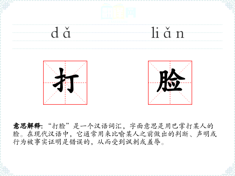 “打脸”是一个汉语词汇,字面意思是用巴掌打某人的脸。在现代汉语中,它通常用来比喻某人之前做出的判断、声明或行为被事实证明是错误的,从而受到讽刺或羞辱。