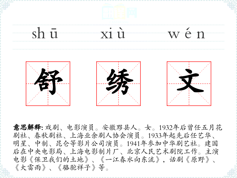 1.戏剧、电影演员。安徽黟县人。女。1932年后曾任五月花剧社、春秋剧社、上海业余剧人协会演员。1933年起先后任艺华、明星、中制、昆仑等影片公司演员。1941年参加中华剧艺社。建国后在中央电影局、上海电影制片厂、北京人民艺术剧院工作。主演电影《保卫我们的土地》、《一江春水向东流》,话剧《原野》、《大雷雨》、《骆驼祥子》等。