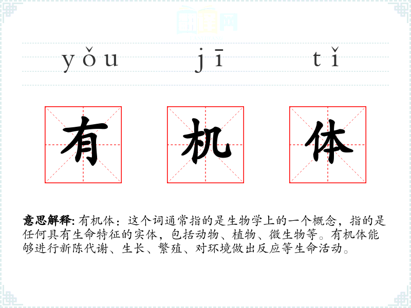 有机体:这个词通常指的是生物学上的一个概念,指的是任何具有生命特征的实体,包括动物、植物、微生物等。有机体能够进行新陈代谢、生长、繁殖、对环境做出反应等生命活动。