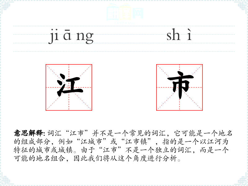 词汇“江市”并不是一个常见的词汇,它可能是一个地名的组成部分,例如“江城市”或“江市镇”,指的是一个以江河为特征的城市或城镇。由于“江市”不是一个独立的词汇,而是一个可能的地名组合,因此我们将从这个角度进行分析。