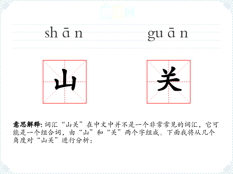 - 对应词汇:在其他语言中,如英语,可能用“mountain pass”或“mountain fortress”来对应“山关”。