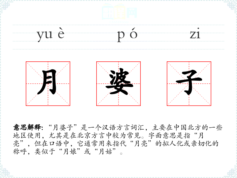 “月婆子”是一个汉语方言词汇,主要在**北方的一些地区使用,尤其是在北京方言中较为常见。字面意思是指“月亮”,但在口语中,它通常用来指代“月亮”的拟人化或亲切化的称呼,类似于“月娘”或“月姑”。