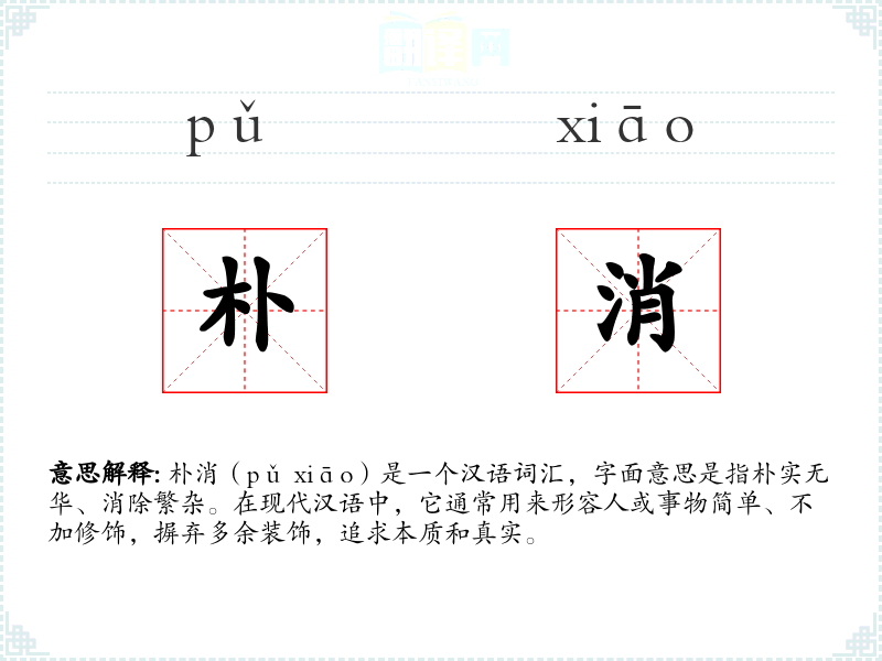 朴消(pǔ xiāo)是一个汉语词汇,字面意思是指朴实无华、消除繁杂。在现代汉语中,它通常用来形容人或事物简单、不加修饰,摒弃多余装饰,追求本质和真实。