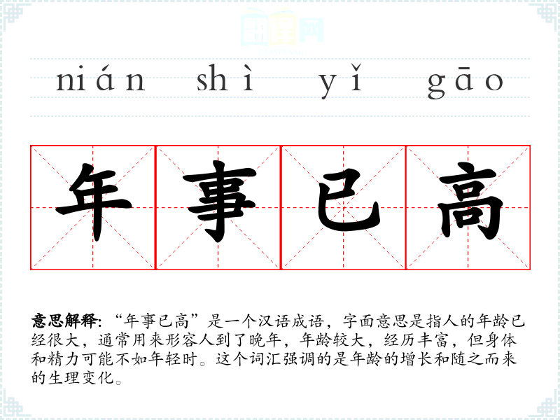 “年事已高”是一个汉语成语,字面意思是指人的年龄已经很大,通常用来形容人到了晚年,年龄较大,经历丰富,但身体和精力可能不如年轻时。这个词汇强调的是年龄的增长和随之而来的生理变化。