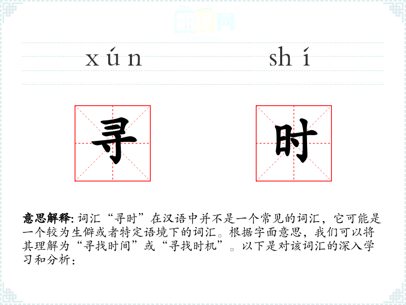 词汇“寻时”在汉语中并不是一个常见的词汇,它可能是一个较为生僻或者特定语境下的词汇。根据字面意思,我们可以将其理解为“寻找时间”或“寻找时机”。以下是对该词汇的深入学*和分析: