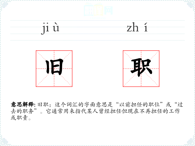 旧职:这个词汇的字面意思是“以前担任的职位”或“过去的职务”。它通常用来指代某人曾经担任但现在不再担任的工作或职责。