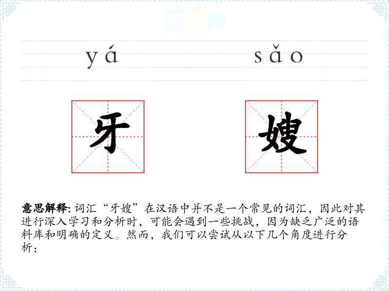 总的来说,“牙嫂”这个词汇在标准汉语中并不常见,可能需要结合特定的语境或方言背景来理解其含义。如果有特定的语境或方言背景,可能会有相关的分析和理解。
