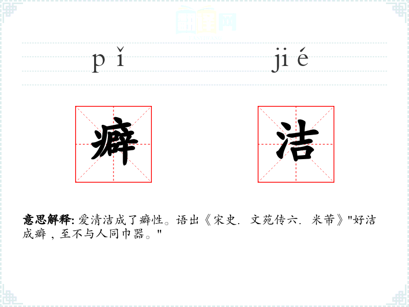 爱清洁成了癖性。语出《宋史.文苑传六.米芾》"好洁成癖﹐至不与人同巾器。"