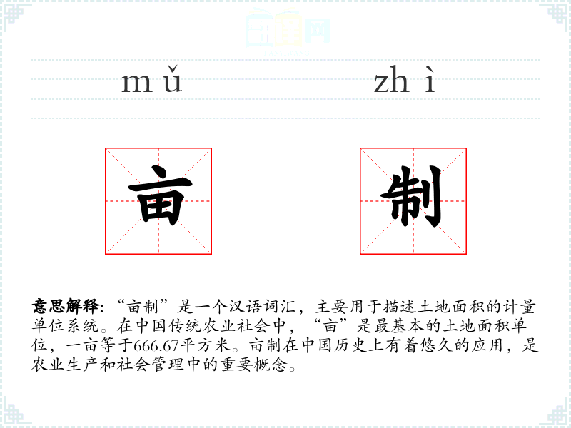 “亩制”是一个汉语词汇,主要用于描述土地面积的计量单位系统。在传统农业社会中,“亩”是最基本的土地面积单位,一亩等于**.7平方米。亩制在历史上有着悠久的应用,是农业生产和社会管理中的重要概念。