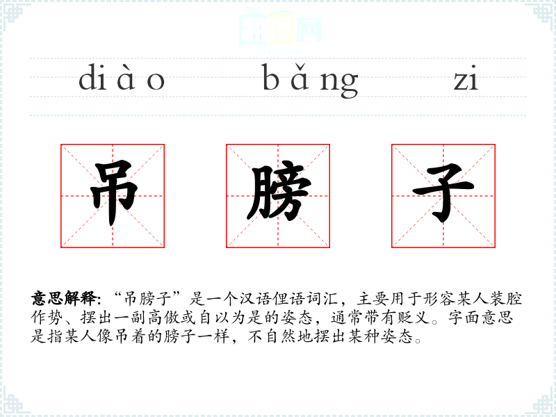 “吊膀子”是一个汉语俚语词汇,主要用于形容某人装腔作势、摆出一副高傲或自以为是的姿态,通常带有贬义。字面意思是指某人像吊着的膀子一样,不自然地摆出某种姿态。