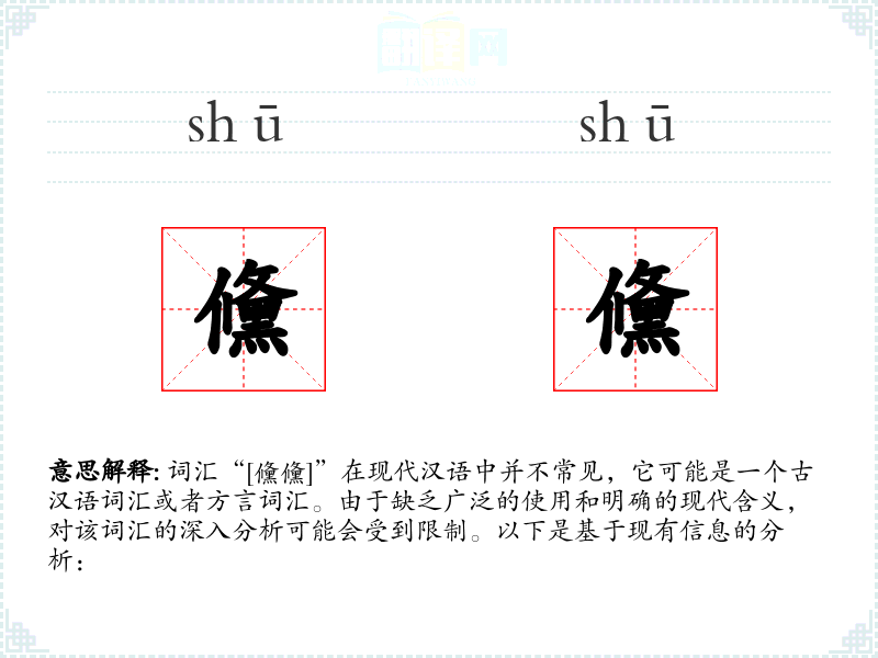 词汇“[儵儵]”在现代汉语中并不常见,它可能是一个古汉语词汇或者方言词汇。由于缺乏广泛的使用和明确的现代含义,对该词汇的深入分析可能会受到限制。以下是基于现有信息的分析: