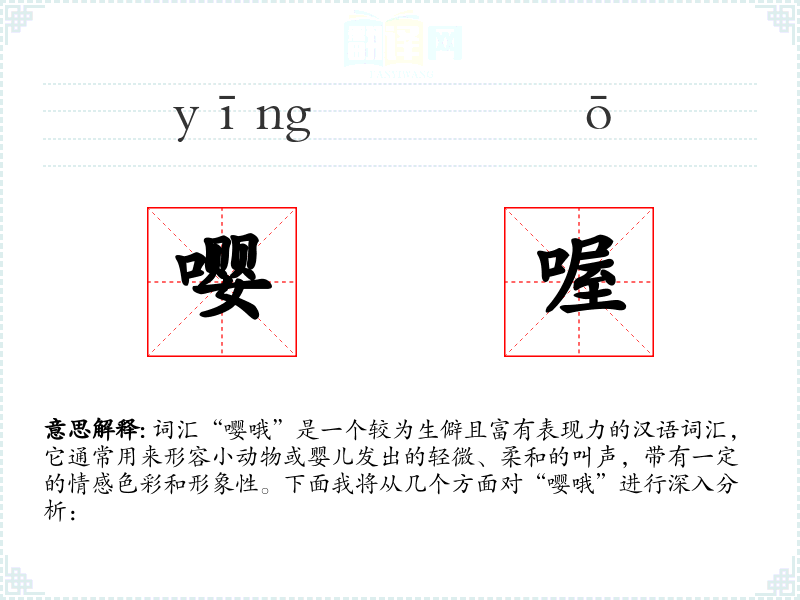 词汇“嘤哦”是一个较为生僻且富有表现力的汉语词汇,它通常用来形容小动物或婴儿发出的轻微、柔和的叫声,带有一定的情感色彩和形象性。下面我将从几个方面对“嘤哦”进行深入分析: