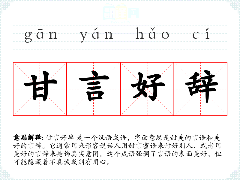 甘言好辞 是一个汉语成语,字面意思是甜美的言语和美好的言辞。它通常用来形容说话人用甜言蜜语来讨好别人,或者用美好的言辞来掩饰真实意图。这个成语强调了言语的表面美好,但可能隐藏着不真诚或别有用心。