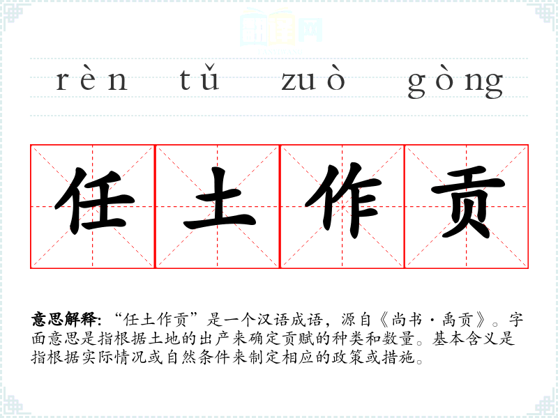 “任土作贡”是一个汉语成语,源自《尚书·禹贡》。字面意思是指根据土地的出产来确定贡赋的种类和数量。基本含义是指根据实际情况或自然条件来制定相应的政策或措施。