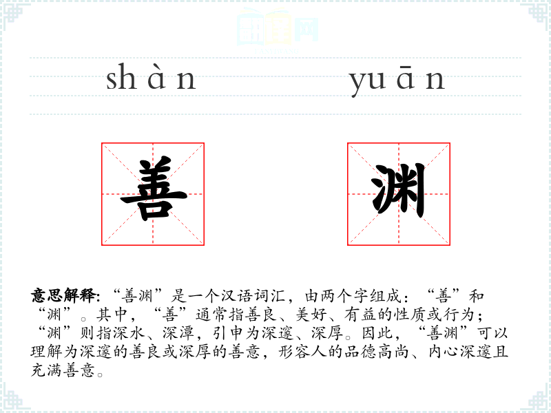 “善”字最早见于甲骨文,原意为吉祥、美好,后引申为善良、善行。“渊”字则最早见于金文,原意为深水,后引申为深邃、深厚。两者结合形成的“善渊”,在古代文献中较少见,更多是在现代文学和口语中被使用,用以形容人的内心世界和品德。