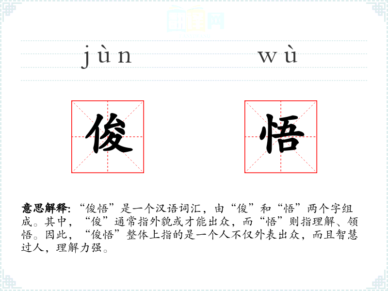 “俊悟”是一个汉语词汇,由“俊”和“悟”两个字组成。其中,“俊”通常指外貌或才能出众,而“悟”则指理解、领悟。因此,“俊悟”整体上指的是一个人不仅外表出众,而且智慧过人,理解力强。