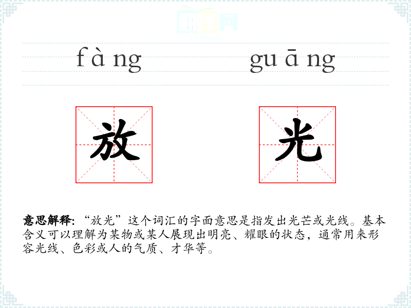 “放光”这个词汇的字面意思是指发出光芒或光线。基本含义可以理解为某物或某人展现出明亮、耀眼的状态,通常用来形容光线、色彩或人的气质、才华等。