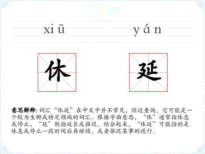 词汇“休延”在中文中并不常见,经过查询,它可能是一个较为生僻或特定领域的词汇。根据字面意思,“休”通常指休息或停止,“延”则指延长或推迟。结合起来,“休延”可能指的是休息或停止一段时间后再继续,或者推迟某事的进行。