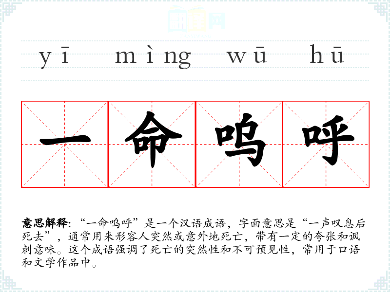 “一命呜呼”这个成语在汉语中是一个常用的表达,用于描述突然和意外的死亡。它在文学和口语中都有广泛的应用,能够增加文本的情感深度和戏剧性。了解和掌握这个成语,对于理解和运用汉语具有重要意义。