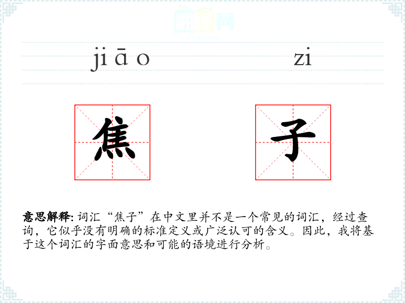 词汇“焦子”在中文里并不是一个常见的词汇,经过查询,它似乎没有明确的标准定义或广泛认可的含义。因此,我将基于这个词汇的字面意思和可能的语境进行分析。
