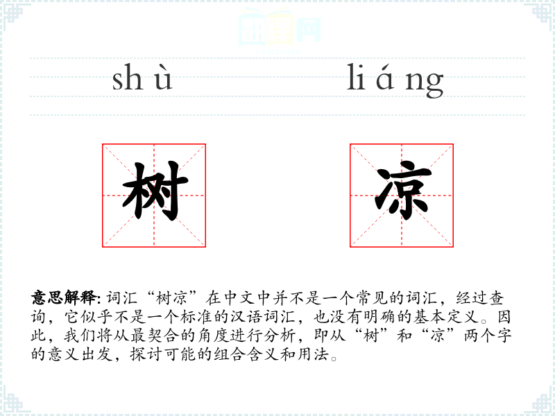 词汇“树凉”在中文中并不是一个常见的词汇,经过查询,它似乎不是一个标准的汉语词汇,也没有明确的基本定义。因此,我们将从最契合的角度进行分析,即从“树”和“凉”两个字的意义出发,探讨可能的组合含义和用法。
