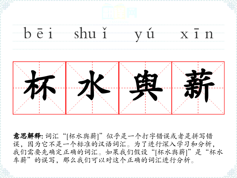 词汇“[杯水舆薪]”似乎是一个打字错误或者是拼写错误,因为它不是一个标准的汉语词汇。为了进行深入学*和分析,我们需要先确定正确的词汇。如果我们假设“[杯水舆薪]”是“杯水车薪”的误写,那么我们可以对这个正确的词汇进行分析。