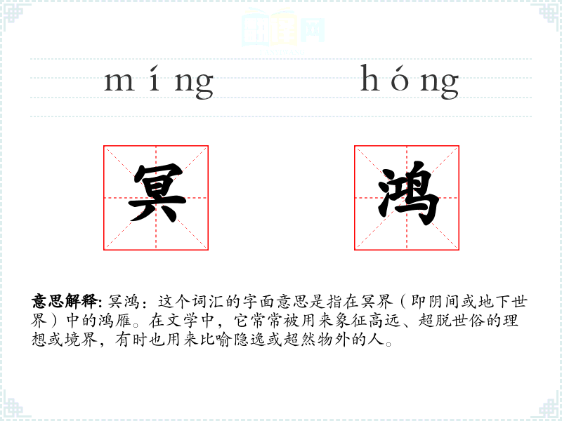 冥鸿:这个词汇的字面意思是指在冥界(即阴间或地下世界)中的鸿雁。在文学中,它常常被用来象征高远、超脱世俗的理想或境界,有时也用来比喻隐逸或超然物外的人。