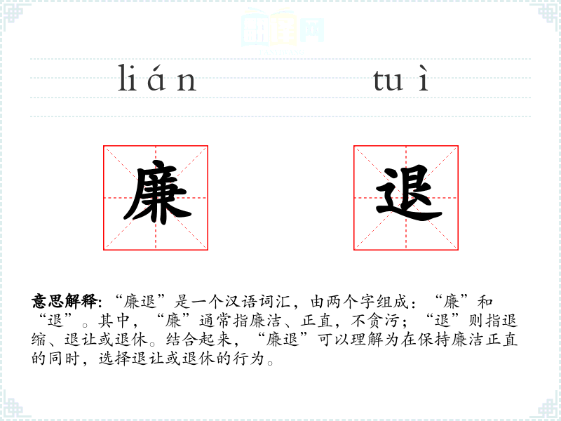 “廉”字最早见于《说文解字》,意为“不贪”。“退”字则有“后退”、“退让”之意。两个字组合起来,形成了“廉退”这个词汇,强调在保持廉洁的同时选择退让或退休。