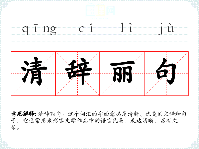 清辞丽句:这个词汇的字面意思是清新、优美的文辞和句子。它通常用来形容文学作品中的语言优美、表达清晰、富有文采。