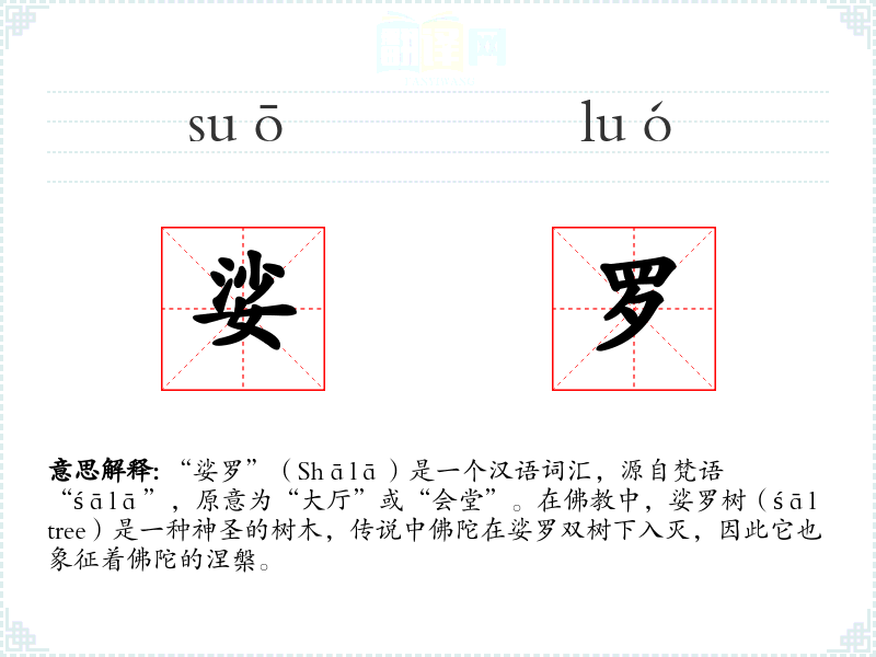 “娑罗”(Shālā)是一个汉语词汇,源自梵语“śālā”,原意为“大厅”或“会堂”。在**中,娑罗树(śāl tree)是一种神圣的树木,传说中佛陀在娑罗双树下入灭,因此它也象征着佛陀的涅槃。