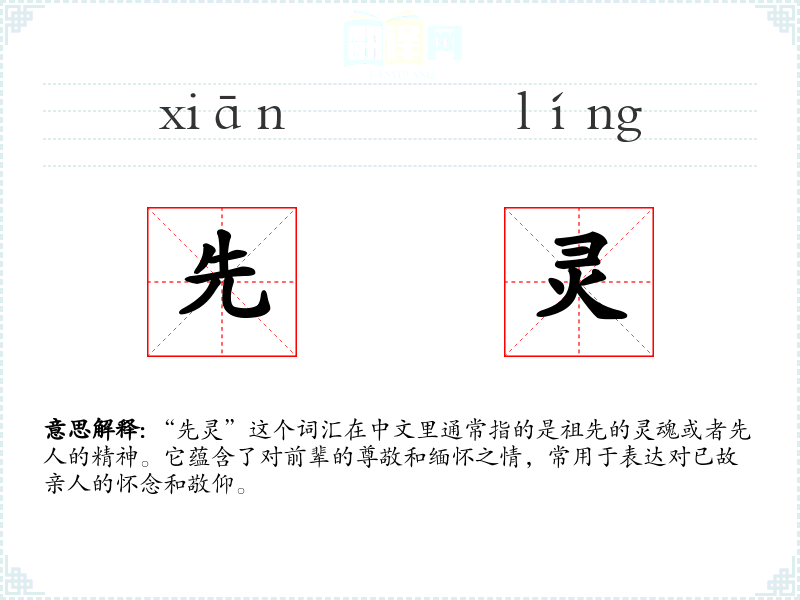 “先灵”这个词汇在中文里通常指的是祖先的灵魂或者先人的精神。它蕴含了对前辈的尊敬和缅怀之情,常用于表达对已故亲人的怀念和敬仰。