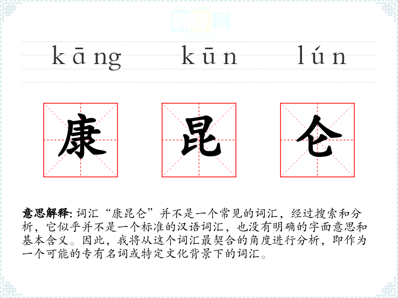 词汇“康昆仑”并不是一个常见的词汇,经过搜索和分析,它似乎并不是一个标准的汉语词汇,也没有明确的字面意思和基本含义。因此,我将从这个词汇最契合的角度进行分析,即作为一个可能的专有名词或特定文化背景下的词汇。