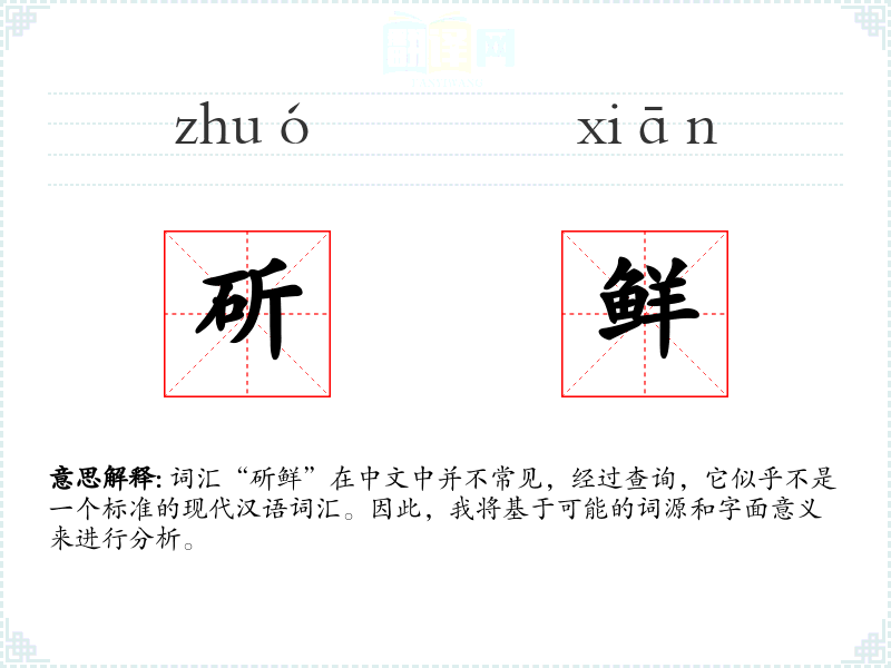 词汇“斫鲜”在中文中并不常见,经过查询,它似乎不是一个标准的现代汉语词汇。因此,我将基于可能的词源和字面意义来进行分析。