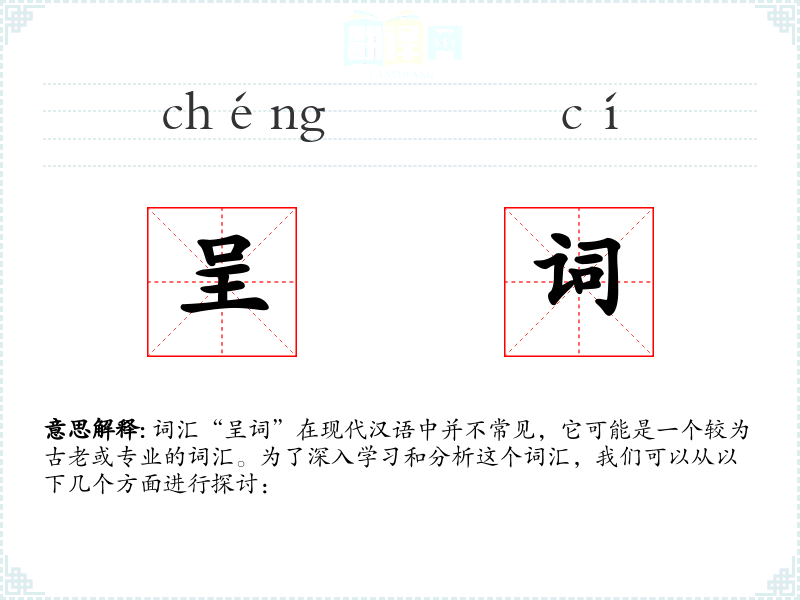 词汇“呈词”在现代汉语中并不常见,它可能是一个较为古老或专业的词汇。为了深入学*和分析这个词汇,我们可以从以下几个方面进行探讨: