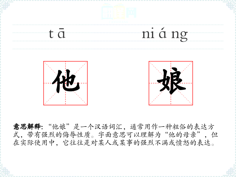“他娘”是一个汉语词汇,通常用作一种粗俗的表达方式,带有强烈的侮辱性质。字面意思可以理解为“他的母亲”,但在实际使用中,它往往是对某人或某事的强烈不满或愤怒的表达。