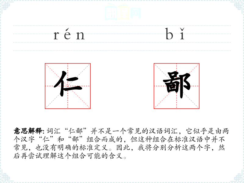 词汇“仁鄙”并不是一个常见的汉语词汇,它似乎是由两个汉字“仁”和“鄙”组合而成的,但这种组合在标准汉语中并不常见,也没有明确的标准定义。因此,我将分别分析这两个字,然后再尝试理解这个组合可能的含义。