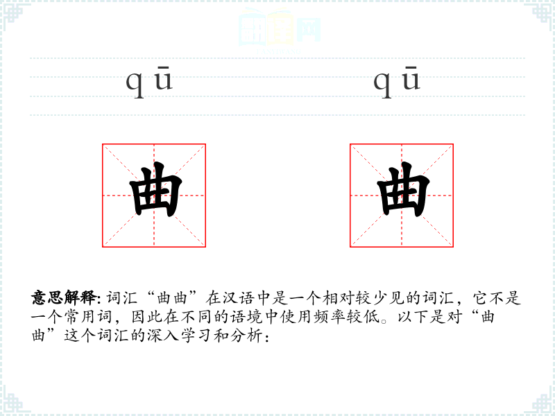 词汇“曲曲”在汉语中是一个相对较少见的词汇,它不是一个常用词,因此在不同的语境中使用频率较低。以下是对“曲曲”这个词汇的深入学*和分析: