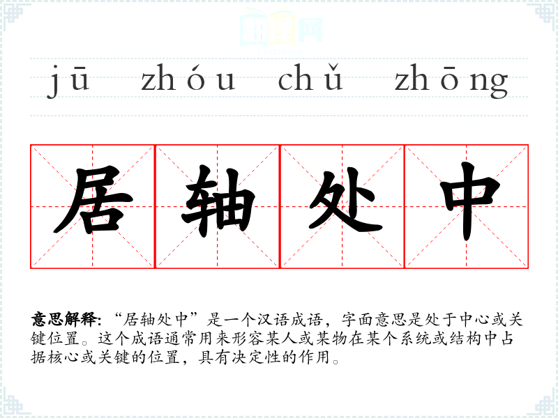 “居轴处中”是一个汉语成语,字面意思是处于中心或关键位置。这个成语通常用来形容某人或某物在某个系统或结构中占据核心或关键的位置,具有决定性的作用。