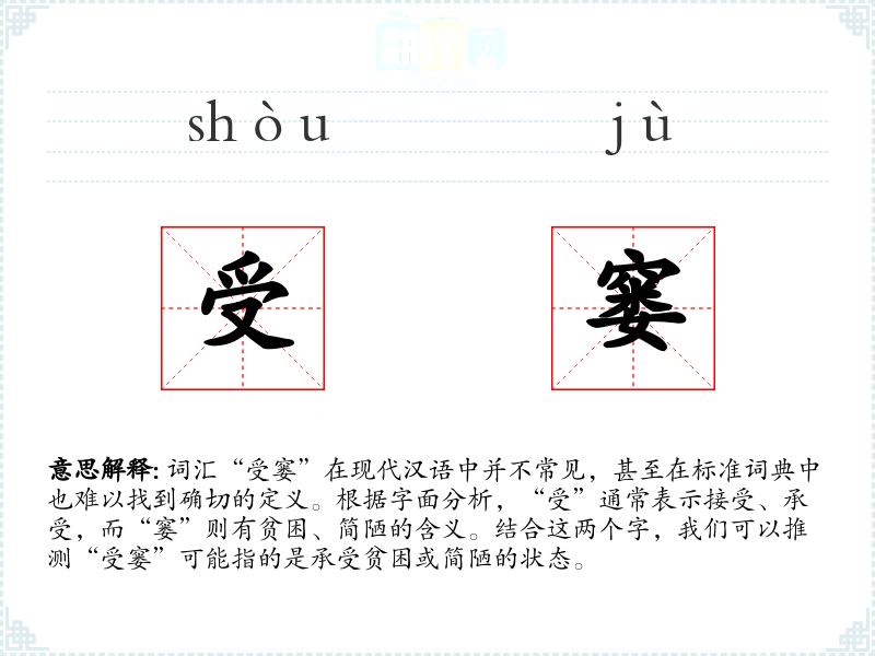 词汇“受窭”在现代汉语中并不常见,甚至在标准词典中也难以找到确切的定义。根据字面分析,“受”通常表示接受、承受,而“窭”则有贫困、简陋的含义。结合这两个字,我们可以推测“受窭”可能指的是承受贫困或简陋的状态。